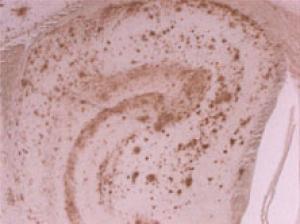 The primary pathological findings in AD are neurofibrillary tangles and plaques. Tangles are, as the name implies, tangle of tau protein. Plaques are more sheet-like in form and are comprised of another protein, beta-amyloid. In the pictures below, the top one shows tangles and the bottom one plaques.